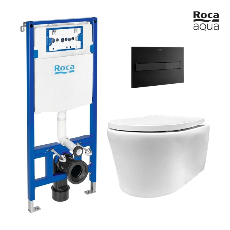 Este conjunto se compone del inodoro suspendido Lia de AQUA Rimless en color blanco brillo con tapa amortiguada, pulsador PL7 Dual Negro mate y cisterna con bastidor oculto Roca Duplo. Incluye anclajes para montaje.