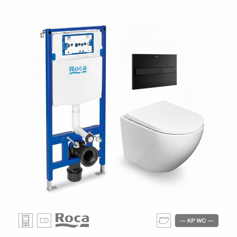 BASTIDOR ROCA DUPLO PACK CISTERNA EMPOTRADA Y PULSADOR PL7 NEG MAT C/ INODORO SUSPENDIDO ROUND SMART BL BR TAPA ENVOL MARCA KP