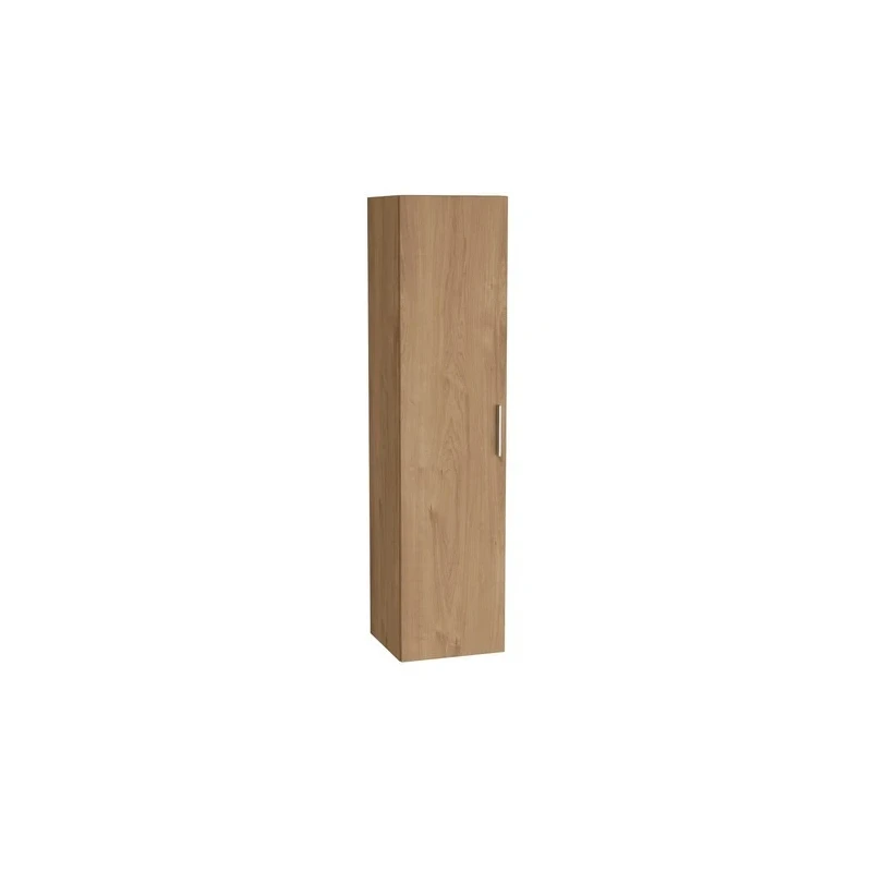 Mueble alto suspendido color Roble para el baño con puerta. Se puede girar para cambiar la apertura de la puerta hacia la izquierda/derecha. Tres estantes internos, dos de ellos regulables en altura.
