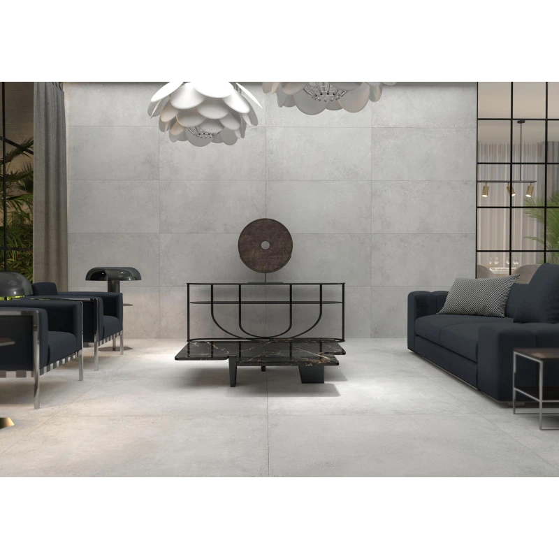 Porcelánico en gran formato de color gris claro de 120X120 rectificado, este tono tiene una buena capacidad para reflejar la luz, lo que ayuda a iluminar y agrandar visualmente los espacios.