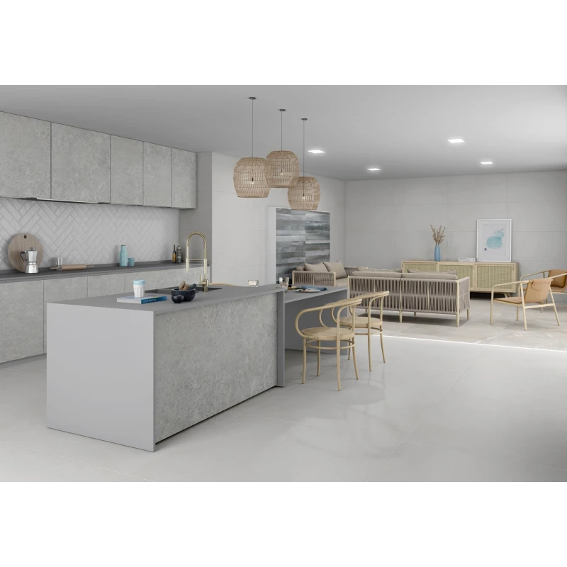 Es un porcelánico de alta calidad que ofrece un aspecto continuo y fluido, minimizando las juntas, que maximiza la belleza de cada superficie.