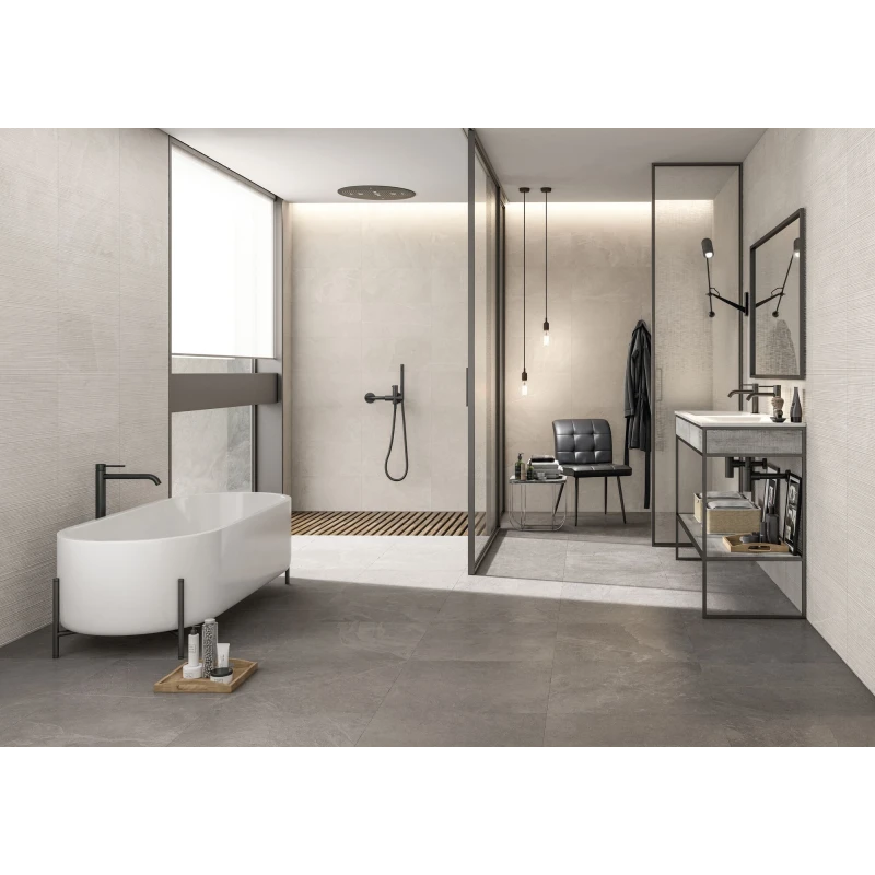 ROAM PEARL MATE 60X120 RECT: Esta cerámica imitación piedra natural en tono perla con relieve y acabado mate ofrece una elegancia atemporal en cualquier ambiente. Su formato rectificado de 60x120 asegura una instalación precisa y un acabado impecable. Ideal para interiores y exteriores, combina estética y funcionalidad con tecnología antideslizante.